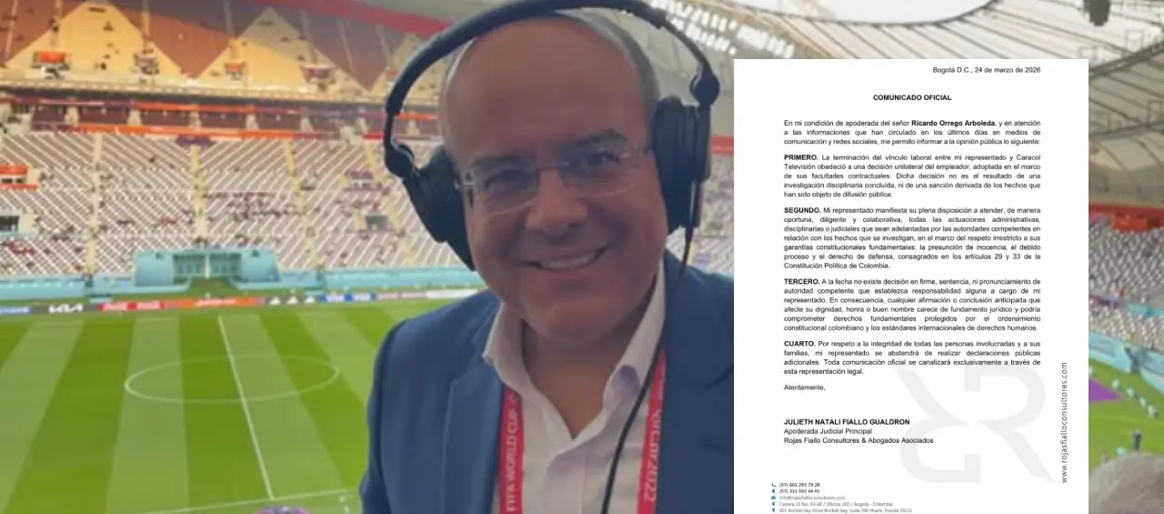 La abogada de Ricardo Orrego, Julieth Natali Fiallo Gualdrón, afirmó que la terminación del contrato del periodista con Caracol Televisión se dio por una decisión unilateral del empleador, en el marco de sus facultades contractuales.